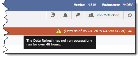 If a data refresh has not successfully completed in the specified number of hours (this is set at the application level using Configuration Setting #5102), a more visual indicator will display to notify the end users. Clicking on the warning icon will provide additional detail, as shown: